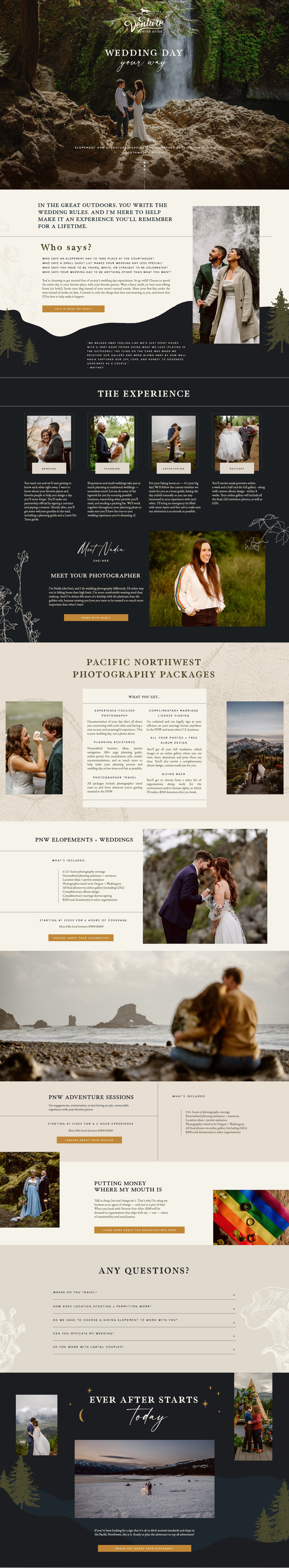 The client: While most wedding photographers are holed up in their studios, Nadia of Venture Ever After prefers to strap on her hiking boots, wipe mud off her camera lens, and climb a tree to get the perfect angle.